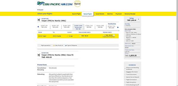 這樣第一段航程 台北→馬尼拉的機票就訂購完成囉!