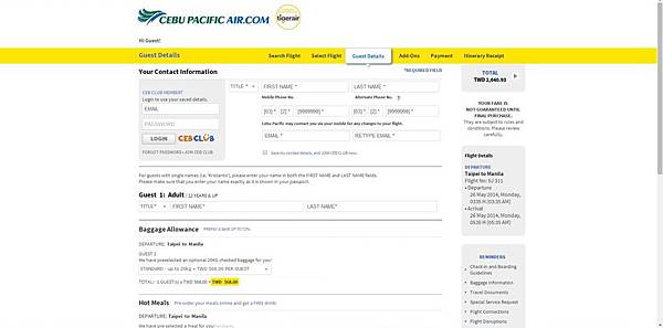 TIPS:加入CEBU CLUB還不錯,在搶票時需要快速輸入完一些資訊,只要你是會員都可以預先記錄在會員資料中,以便快速套用。除了姓名、出生年月日之外,其他乘客的資料以及信用卡資料都可以一併匯入,非常方便!缺點是,會常常寄email給你,跟你說又促銷了囉快來訂票,會讓你非常想再刷機票出國玩……