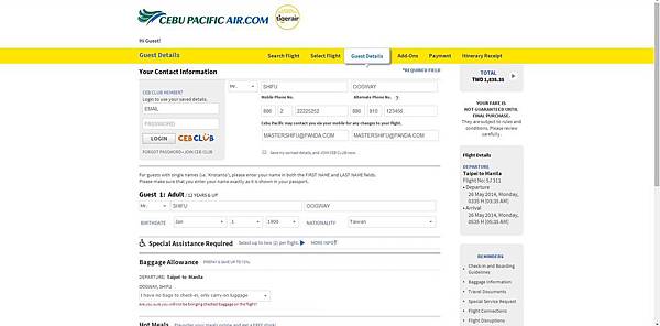 再來填上GUEST 乘客 姓、名、出生年月日與國籍,若有多人以上可以一次填好。