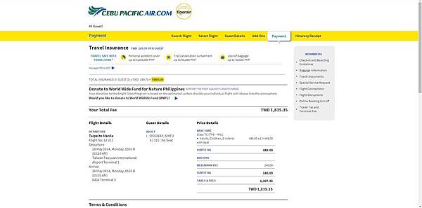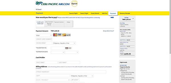 TIPS:若買的機票為PHP計價,在信用卡付款時會詢問你是否換成TWD計價,後面會SHOW匯率,應該是比較差,因此直接以PHP計價,信用卡公司會用好一點的匯率來計算。