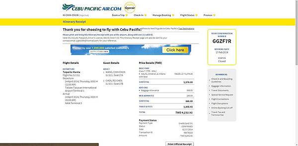 最後一步就完成囉,這份Itinerary Receipt 就是你的收據,基本上列印出來等同電子機票,可以帶著以備不時之需。所有費用都會清楚明列在上頭。